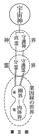 初めに分霊が、宇宙神の創造を顕現するため、その創造性を光の線と彩(あや)なして、幽界肉体界を創造してゆく過程において、みずから発した念波の業因の中に、しだいに自己の本性を見失っていったことは、前章においてすでに説明したのであるが、これは一見、無限の智慧の持主である神の行為の失策の如く見え、この点を疑問に思う人びとが多数あると思うので、この点についてちょっと説明してみよう。 これは、さきに述べた光と影、善がそのまゝ善ならず、悪がそのまゝ悪ならずの説明と同じ原理である。即ち、分霊は、一度(ひとたび)は、肉体の業因縁の中にもてあそばれ、自己の本性を見失ったかのように見えるが、これは、直霊が分霊に命じて、宇宙神の創造を現象界に写し出そうとしている過程にすぎないものである。 しかし、かゝる過程にあって苦悩している分霊を救い、肉体界を浄め、宇宙神の意志そのものの世界とすることが、直霊の最初からの計画であった。そこで、各直霊は自己の光を分けて、分霊たちの守護神となし、守護神は、最初に肉体界の創造にあたった分霊たちを、業因縁の波から救いあげた。この分霊たちは、守護霊となり、守護神に従って、ひきつゞき肉体界に働く後輩の分霊たち、いわゆる、子孫の守護にあたることになった。そして分霊の経験の古いものから、順次に守護霊となり、ついには各人に、必ず一人以上の守護霊がつくまでになって、今日に及んでいる。(第三図参照) 従って、原始時代より、闘いにつづく戦い、苦悩につづく苦悩の歴史が、繰り返され繰り返されて、現代にいたってもまだ、戦争への恐怖、老病貧苦の地獄絵の時代はつづかんとしているが、この間、種々と人類に貢献せる聖者、偉人が数多(あまた)あったことは、分霊である人間が、守護神、守護霊の働きを悟り、これらと協力して、活躍したことを物語るものである。この力は、精神文化、物質文明の発展に寄与することが大きく、守護神、守護霊と、分霊の交流が、更に著しくなってくれば、この世界が真の発展に進むことになるのである。しかし、現在はまだあくまで過程であって、この段階をすぎた未来において、肉体人間の世界が、神の計画通りの、完全調和せる光明世界になることは必至である。それ故、現在の状態が、いかに破滅に瀕せんとする如く見えようとも、決して悲観することも、絶望することもないのであって、各人はひたすら自己の本分を全(まっと)うしていさえすれば、必ず、自己も救われ、世界も救われる日が来るのである。私は、その日の近いことを確信してやまない。 (第四章 終わり)